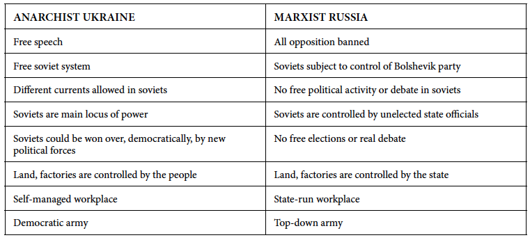 The following chart shows how the anarchist zone (Ukraine) was different to the Marxist zone (Russia):